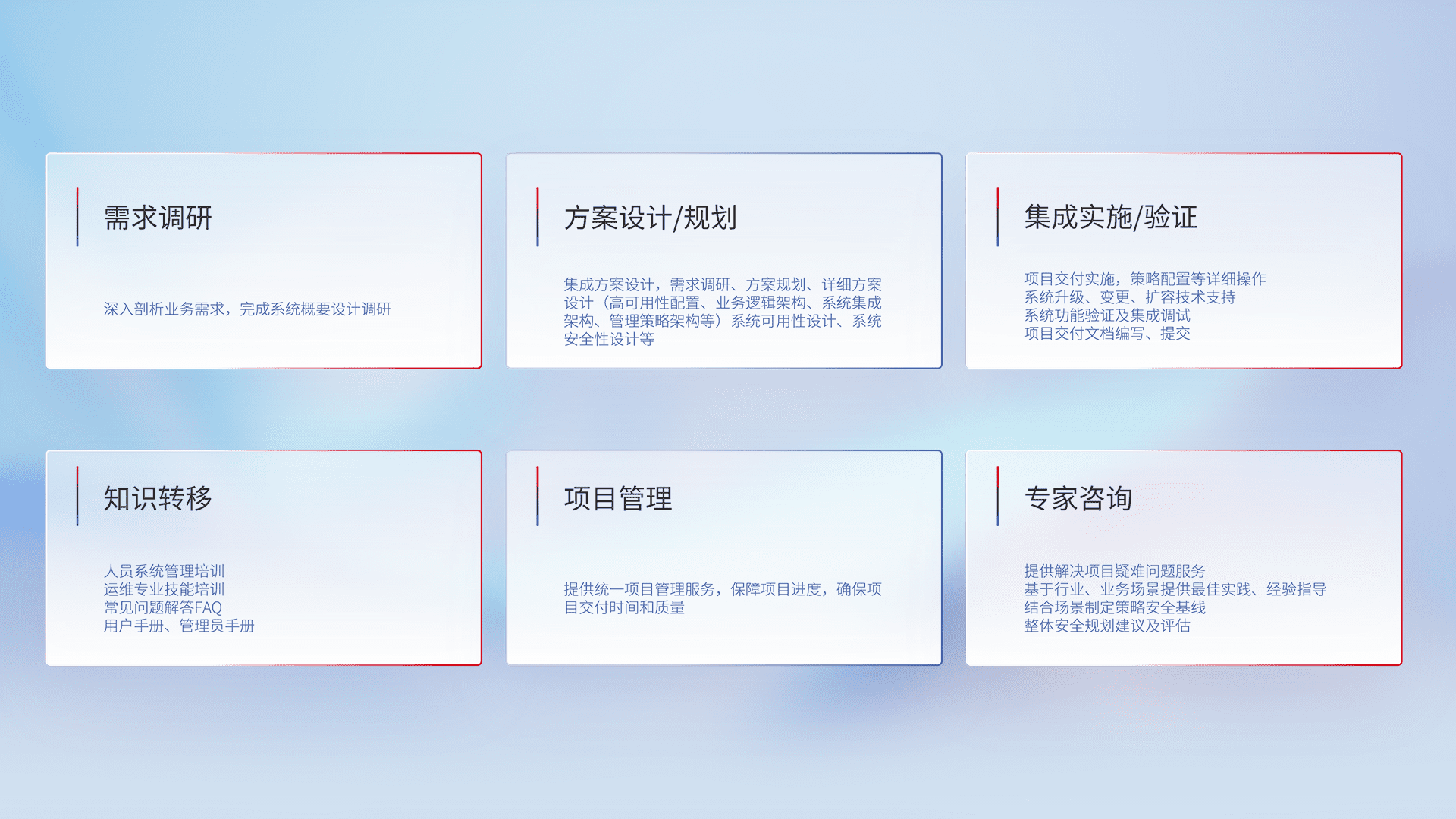 针对客户行业特性,,,,将宏观的安全战略和需求,,通过专业的交付服务,,实现项目落地,,为客户提供标准规范的集成交付服务。。。。